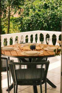 • Balkon of veranda met eettafel en stoelen: perfect voor ontbijt in de ochtendzon
